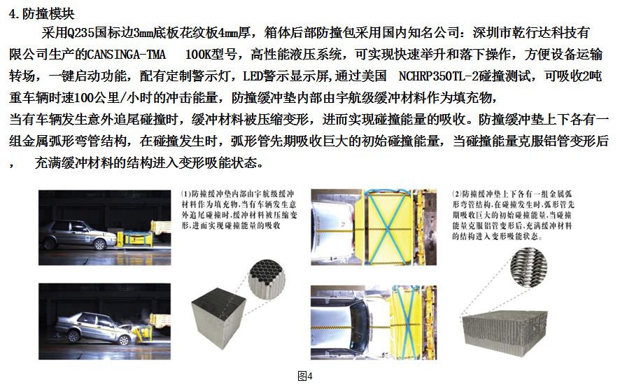 采用Q235國(guó)標(biāo)邊3mm底板花紋板4mm厚,箱體后部防撞緩沖模塊包采用國(guó)際知名技術(shù)產(chǎn)品100K防撞緩 沖模塊,防撞緩沖吸能模塊主要由車載防撞緩沖墊和導(dǎo)向標(biāo)志架組成,充當(dāng)施工作業(yè)車輛后方的緩沖衛(wèi)士。 如若發(fā)生追尾事故,能夠在肇事車輛和前方施工作業(yè)區(qū)域之間構(gòu)建一個(gè)緩沖區(qū)域,通過(guò)機(jī)具結(jié)構(gòu)變形吸收撞 擊的能量,**限度地降低被保護(hù)人員及設(shè)備遭到碰撞的幾率。高性能液壓系統(tǒng),可實(shí)現(xiàn)快速舉升和落下操 作,方便設(shè)備運(yùn)輸轉(zhuǎn)場(chǎng),一鍵啟動(dòng)功能,舉升和落下防撞裝置,當(dāng)防撞裝置未完全落下到工作位置或舉升到 垂直運(yùn)輸位置時(shí),會(huì)有自動(dòng)**告音提示。